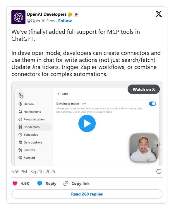 OpenAI расширяет функциональность своего чат-бота. Теперь ChatGPT поддерживает подключение сторонних MCP-серверов. Это открывает путь к глубокой интеграции с внешними приложениями и сервисами — от корпоративных систем до специализированных инструментов.
